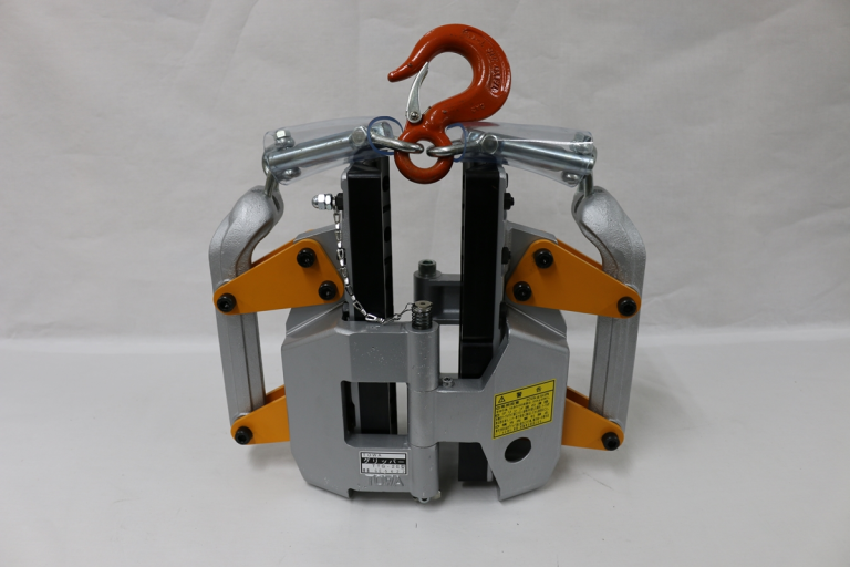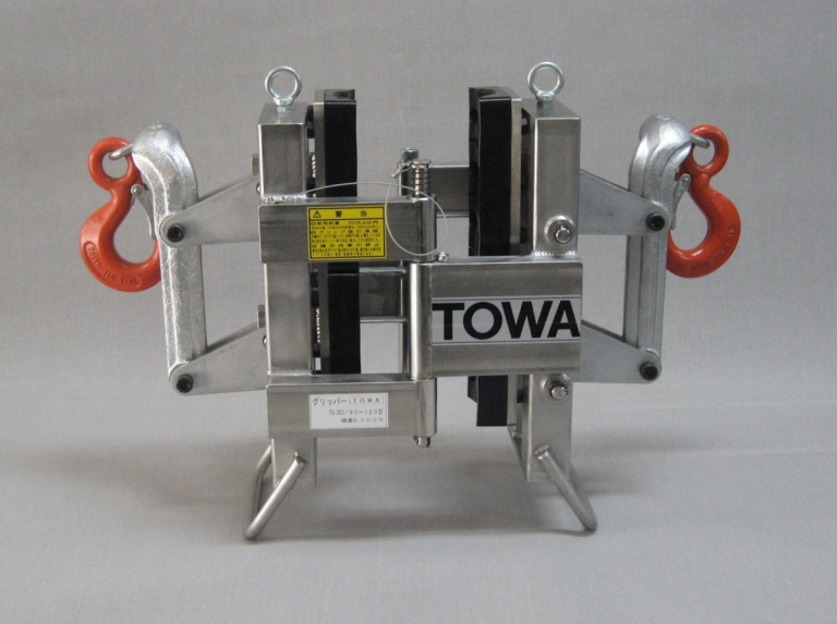 保持用グリッパーは安全の為、短い距離でも2ヶ所以上使用して下さい。最大荷重 1000kg 安全荷重 300kg以内 重量 22.5kg 寸法 W510mm × L190mm × H425mm 適応サイズ φ80~120mm ※ケーブルの種類、仕上がり外径を参考に機種選定願います。