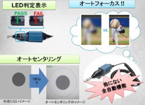 - 業界初の全自動モデル。 センタリング、フォーカス、合否判定を自動化しワンタッチで測定可能。