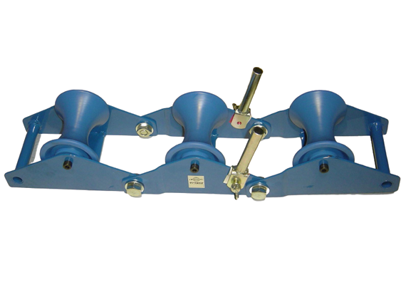 モデル No.40-90TRA 全長 595m/m 全幅 140m/m 全高 120m/m ローラー外径 90φ ローラー内径 40φ ローラー幅 95m/m 最大荷重 4.9kN(500kgf) 本体重量 6.2kg