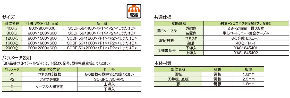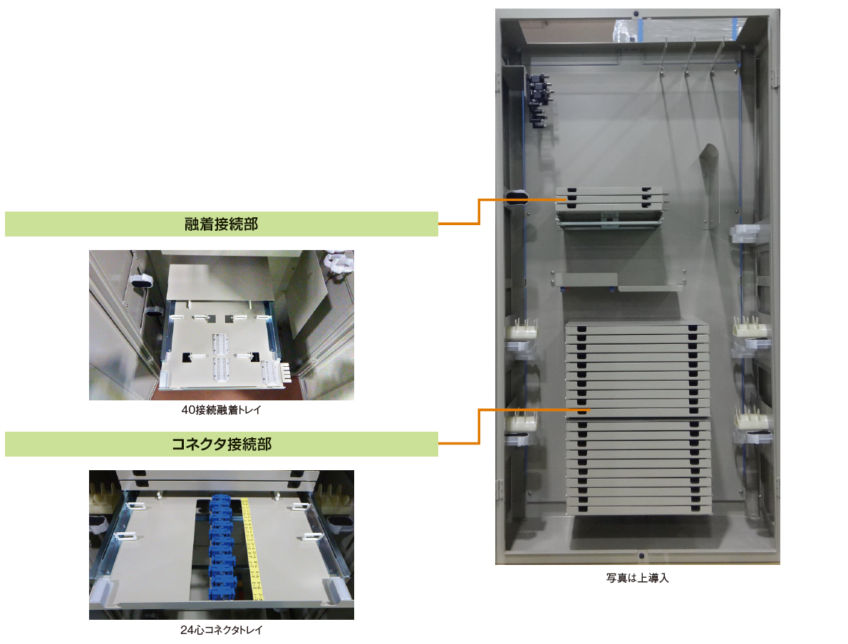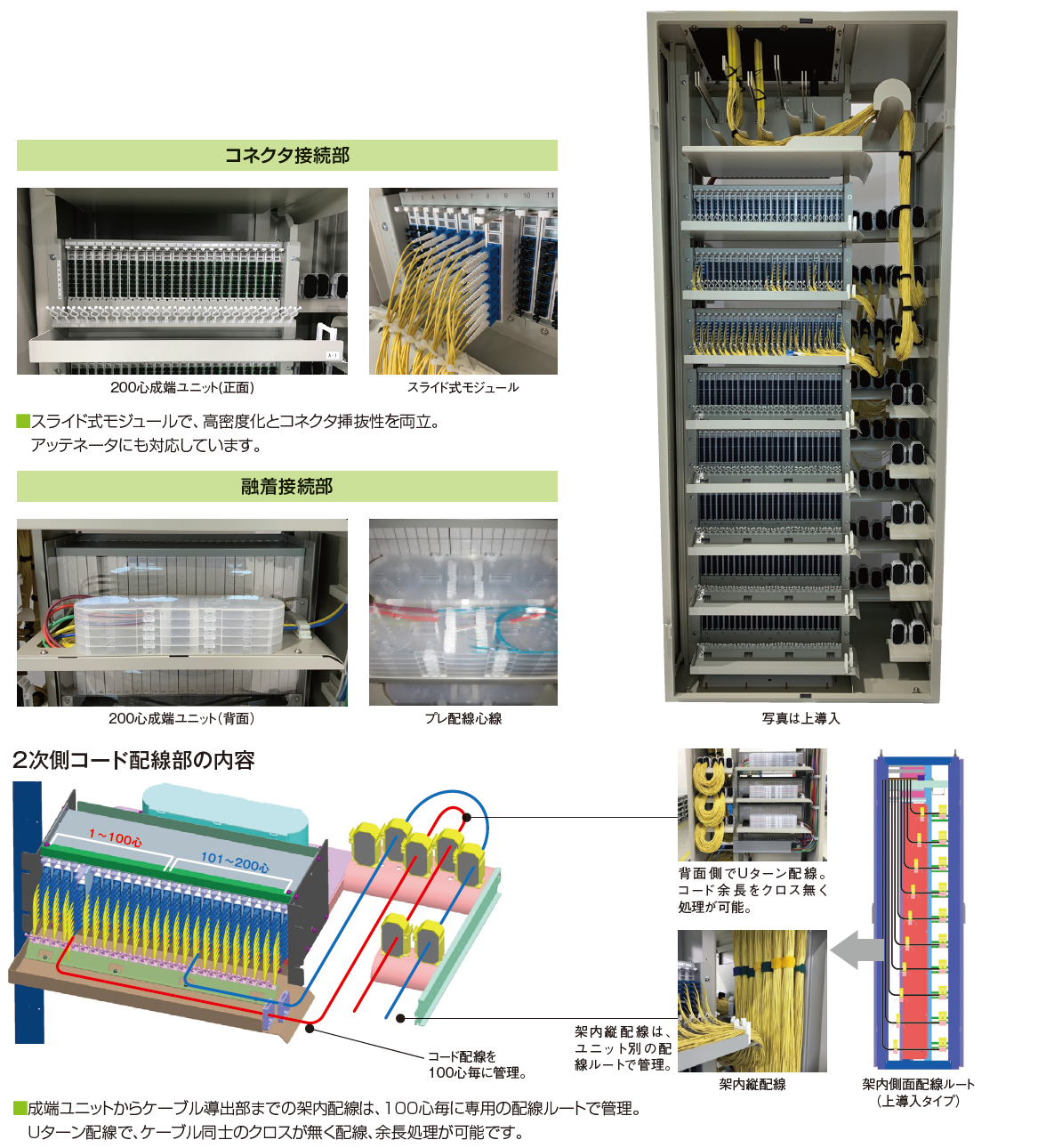 - 最大2000心の融着接続+コネクタ接続可能なプレ配線タイプの高密度成端架です。