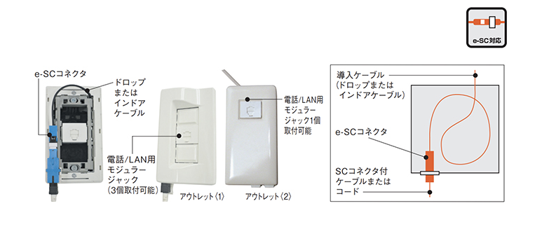 - e-SCコネクタ接続に特化した光コンセントです。心線が露出しないため、取り扱い性に優れています。
