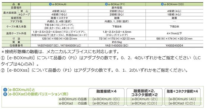 - 丸ケーブル、ドロップケーブル、インドアケーブル、およびコードの導入・導出が可能です。