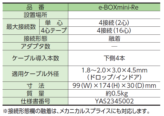 - 最大2心のSCコネクタ接続のほか、最大2接続までの融着接続が可能です。