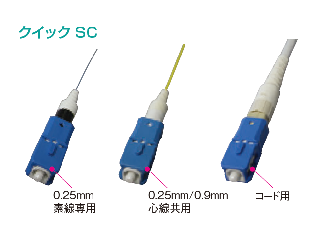 • シングルモード0.25mm素線タイプの単心ドロップケーブル/インドアケーブルに直接SCコネクタを取り付けることができます。