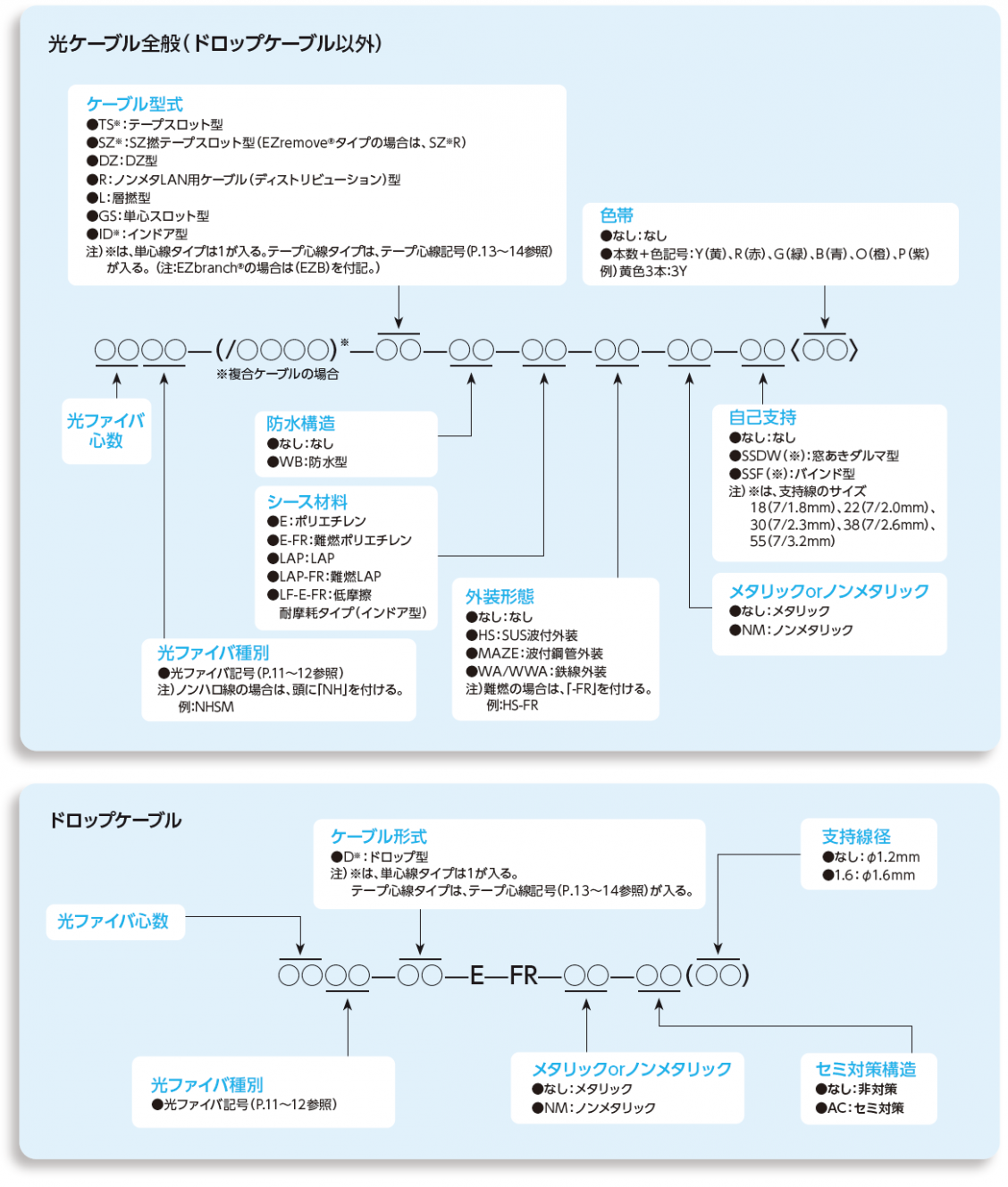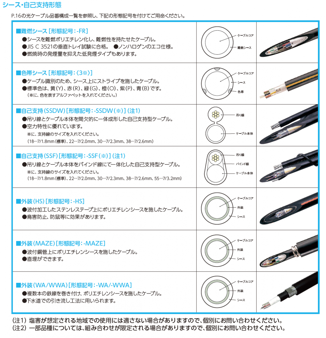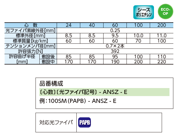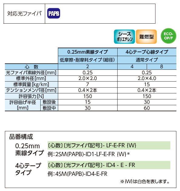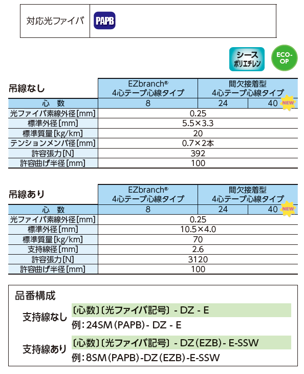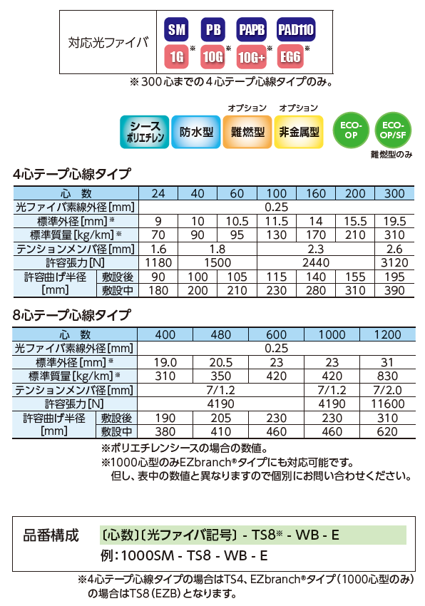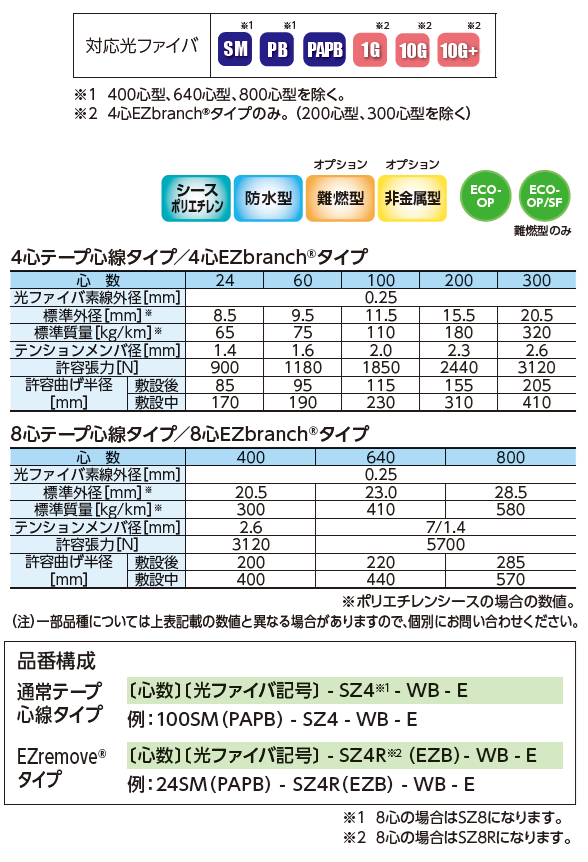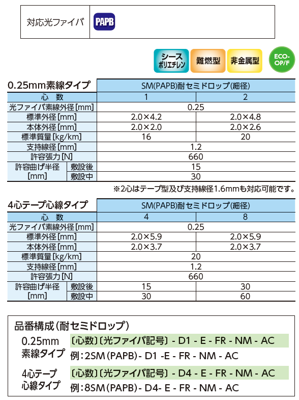 ※SM(PAPB)の1〜8心型の耐セミドロップは、1,000mの定尺品を在庫しています。