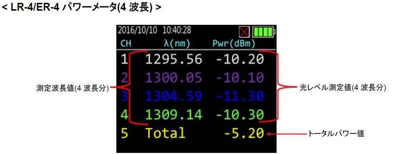 100G LR4/ER4の波長(1295.56、1300.06、1304.59、1309.14)と合算値を同時に測定・表示