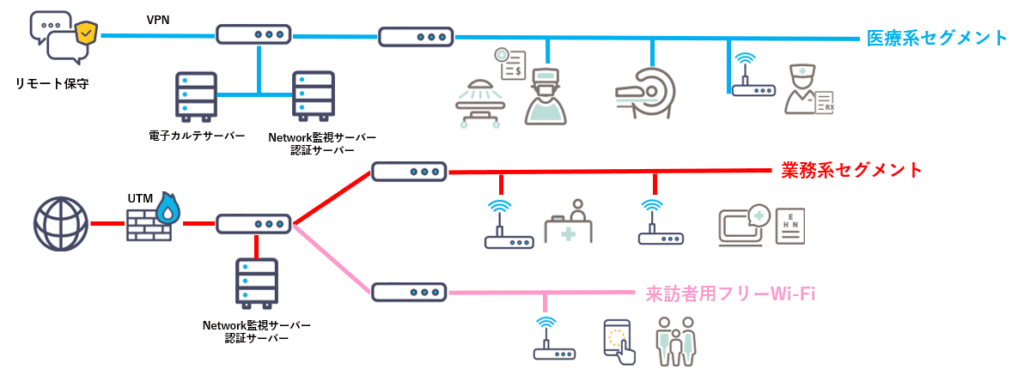 また、セキュリティー対策やポリシーの取り決めが未整備であることや、患者様や職員様へフリーWi-Fiのサービスを提供したいが、情報漏洩や不正アクセスなどのリスクがさらに高まることに対して不安を持たれていました。