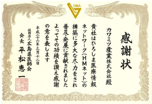 HMネットの構築において、広島県医師会様より表彰をいただきました。