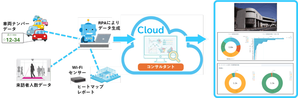 村内で最も多くの来訪者・旅行者が訪れる道の駅に「来訪者数」「どの地域からの来訪者か」「店内のヒートマップ」等のデータを収集するIoTデバイスを設置し、RPAを活用してデータを生成したのちクラウド上のシステムにデータを提供する仕組みを提案構築した。