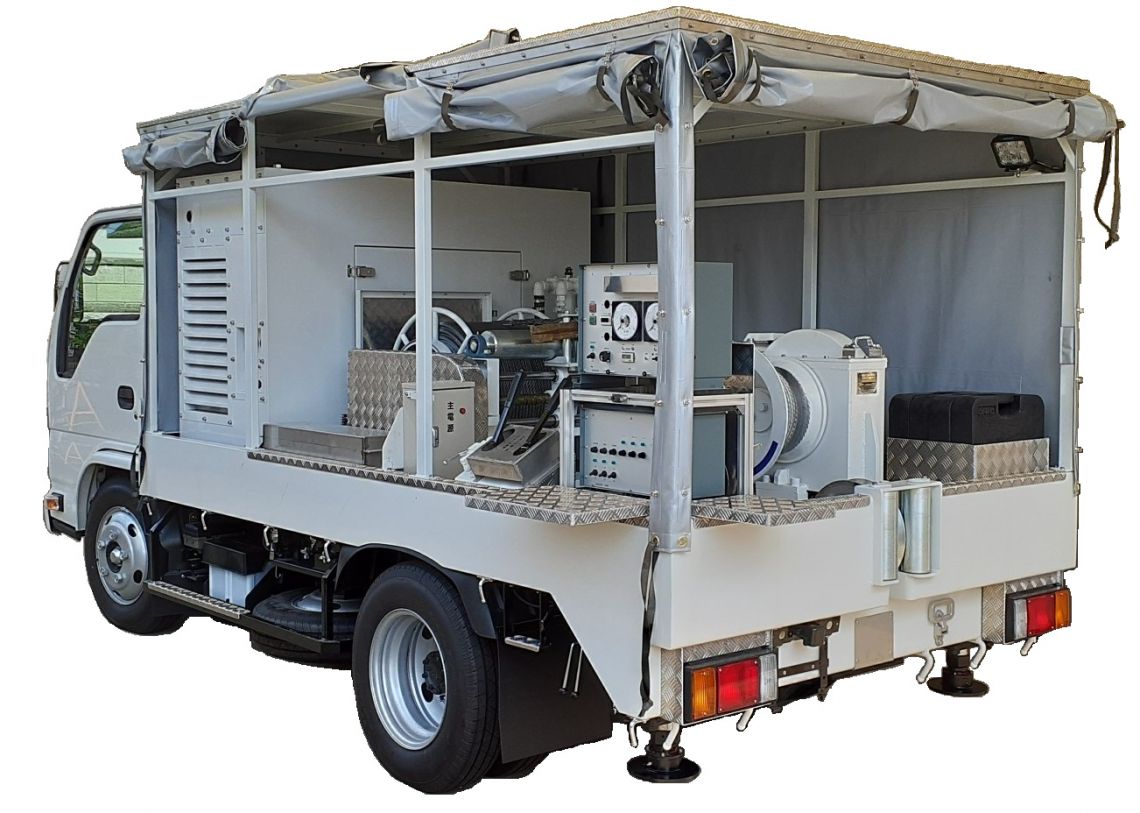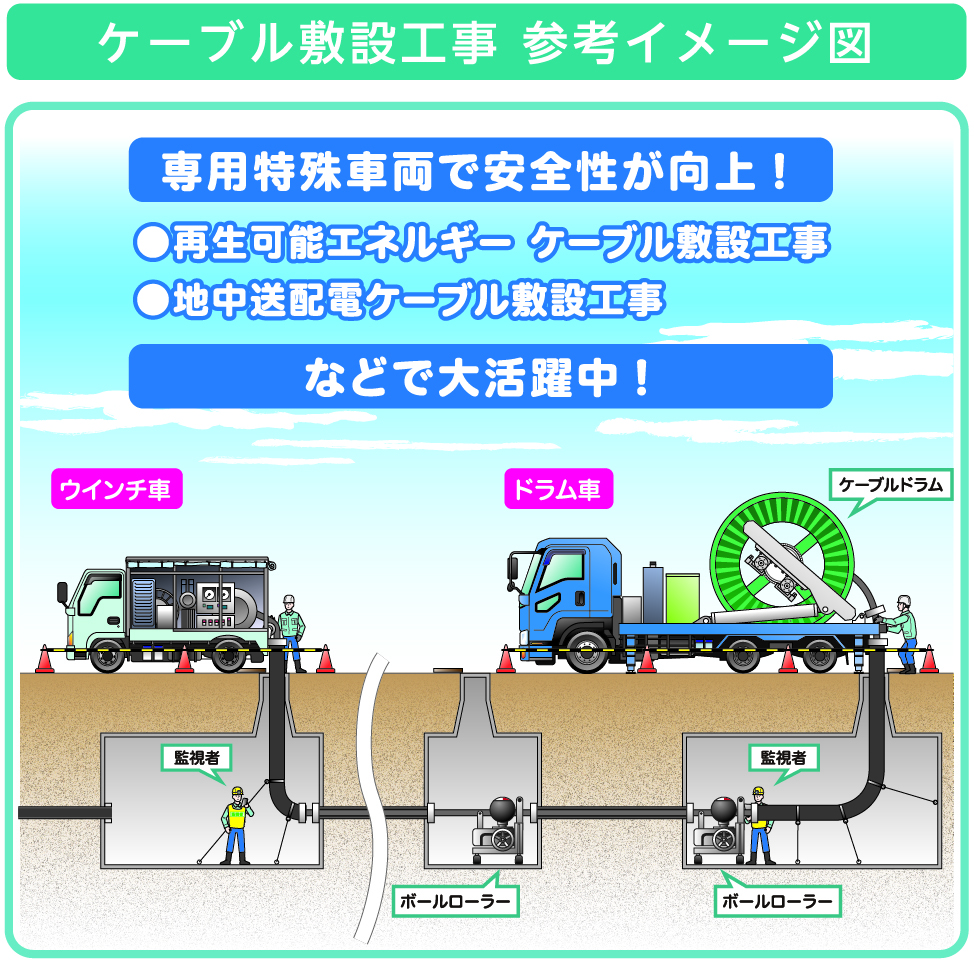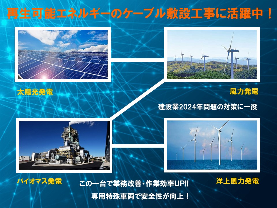 本ウインチ車は再エネ工事にも採用されている油圧式配電工事用ウインチ車です。