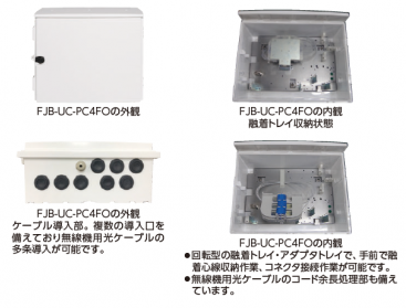 - 携帯電話基地局向けにカスタムした屋外用光成端箱です。複数のケーブル導入口を備えており RU(Radio Unit)無線機用光ケーブルの多条導入に最適化されています。
