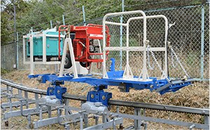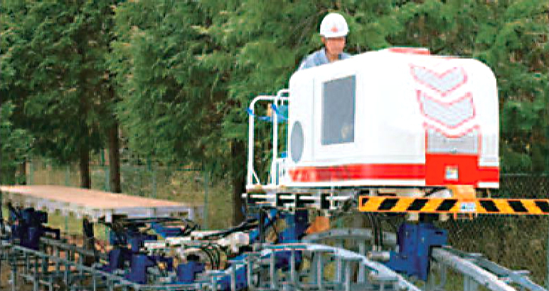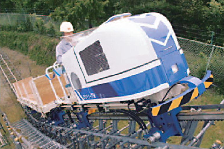 あらゆる過酷な条件が交錯する山岳地で求められるものは、確かな安全性と環境への思いやり。そのすべてのクォリティを高め誕生したのが油圧駆動方式のMt.ライナーです。独自の機構を持つ4サイクル水冷3気筒ディーゼルエンジンの採用により傾斜±45度の走行が安全・スムーズに可能となりました。軌条部は、プレハブ方式の採用で施工・撤去が簡単、また、樹木の伐採は最小限で、整地は不要です。まさに、安全と環境にやさしい究極のマシンです。